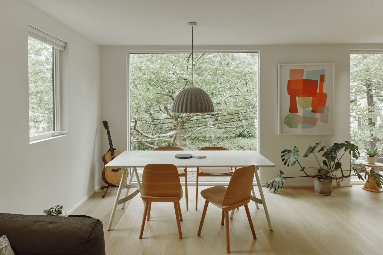Each housing building is organized around an engaged porch, a recessed and screened outdoor room that anchors the plan. Shaped as a triangle, the porch reduces interior corners and mitigates wind pressure during hurricanes. It increases points of roof attachment and consolidates the vulnerable roof edge to a single side. The deep overhang controls solar exposure along the highly glazed shared spaces. The porch presses gently into the shared programs of the plan – kitchen, living, and dining areas – introducing spatial differentiation without interrupting continuity. Inside, a wall of green-stained millwork marks the dramatic vaulted kitchen elevation.