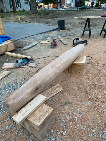 Anchoring the project is a simple food pavilion with a translucent polycarbonate porch, supported by custom “belly” columns. Together, they create a shaded place to gather, order a drink, or just hang out. The porch’s belly columns are hand-planed from solid white oak by a local barn builder. Oversized and deliberately tactile, they invite people to lean against them, wrap an arm around them, or even give them a hug. Their presence brings a sense of unusual familiarity, rooting the project in local craft.