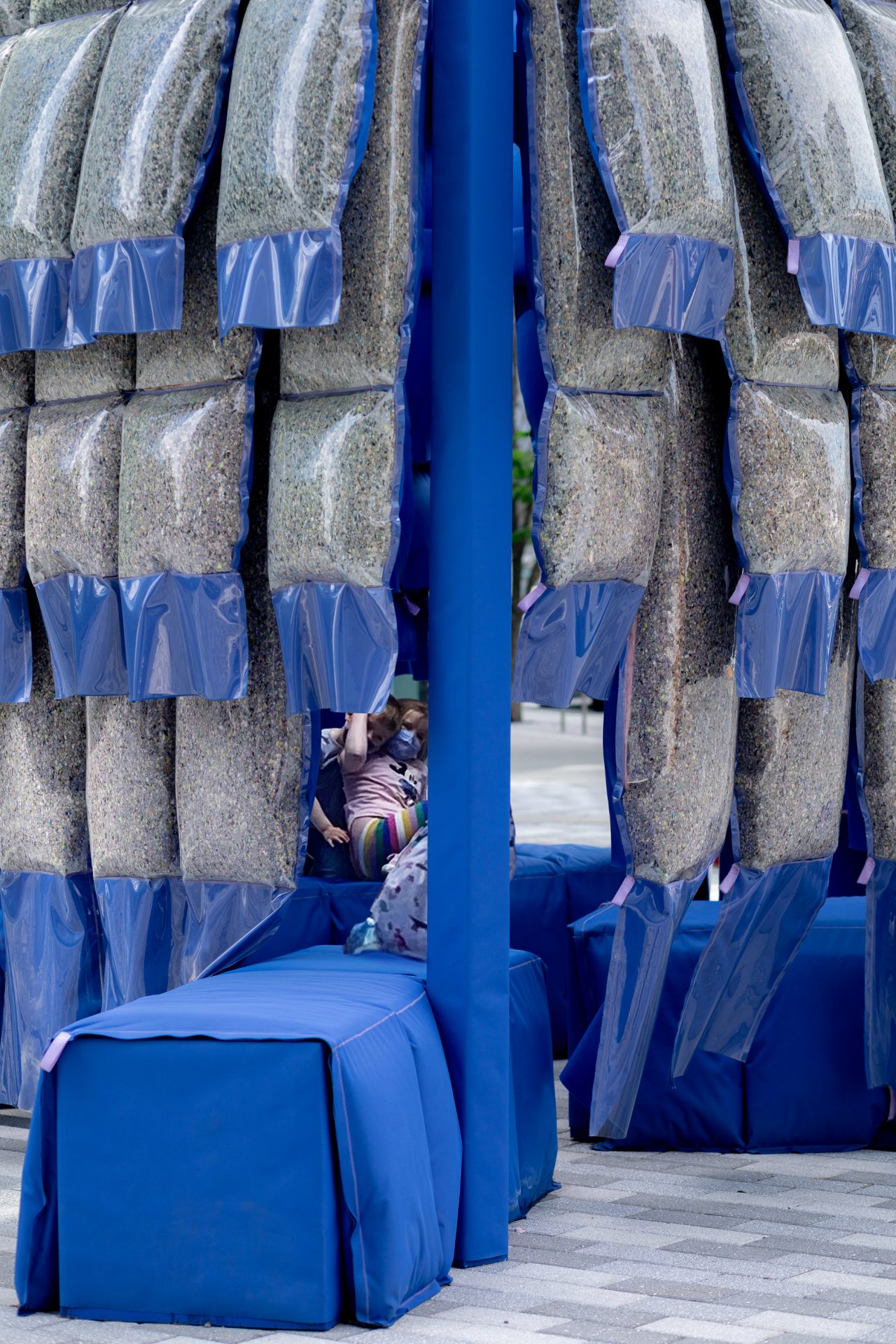 Somewhere between puffy shingles (a New England staple), an heirloom quilt, and the loose fit of a favorite pair of jeans, the pavilion speaks to the familiarity and nostalgia of our collective favorite things. 56 quilted panels are stuffed with recycled denim turned into building insulation and supplemented with fabric waste from the garment industry. The result is a chromatic speckling and indigo hue. Casually draped over the frame, each puffy panel invites us to walk, bump, hug, and lounge freely between the pillow-like walls.