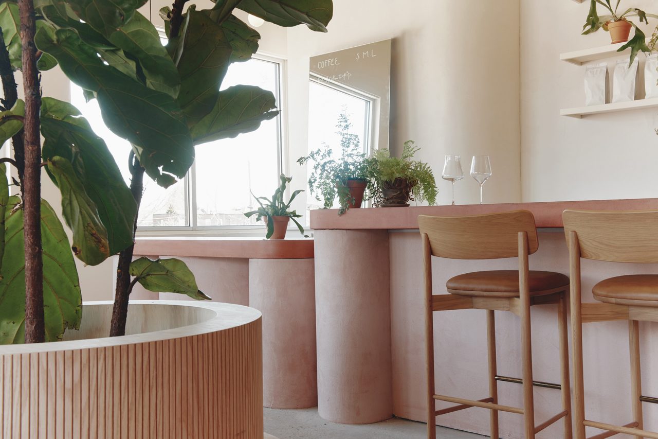Kaffeology is a cafe composed of curves surfaced in plaster.
